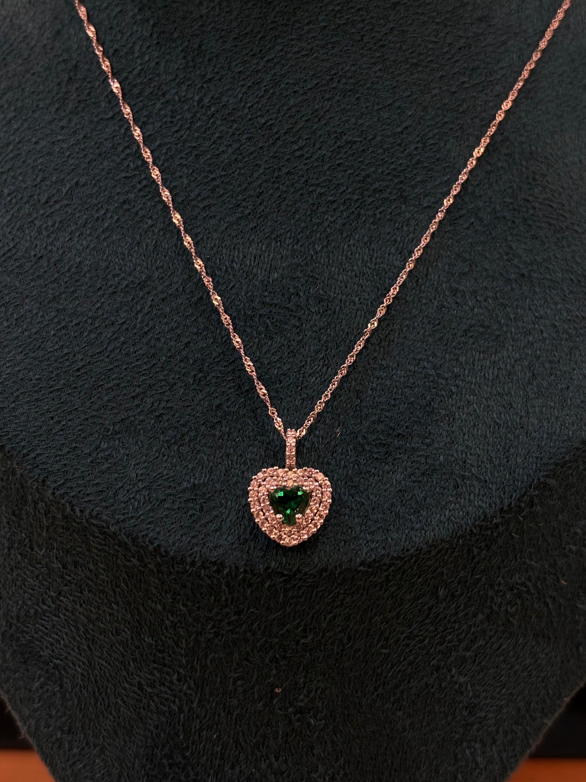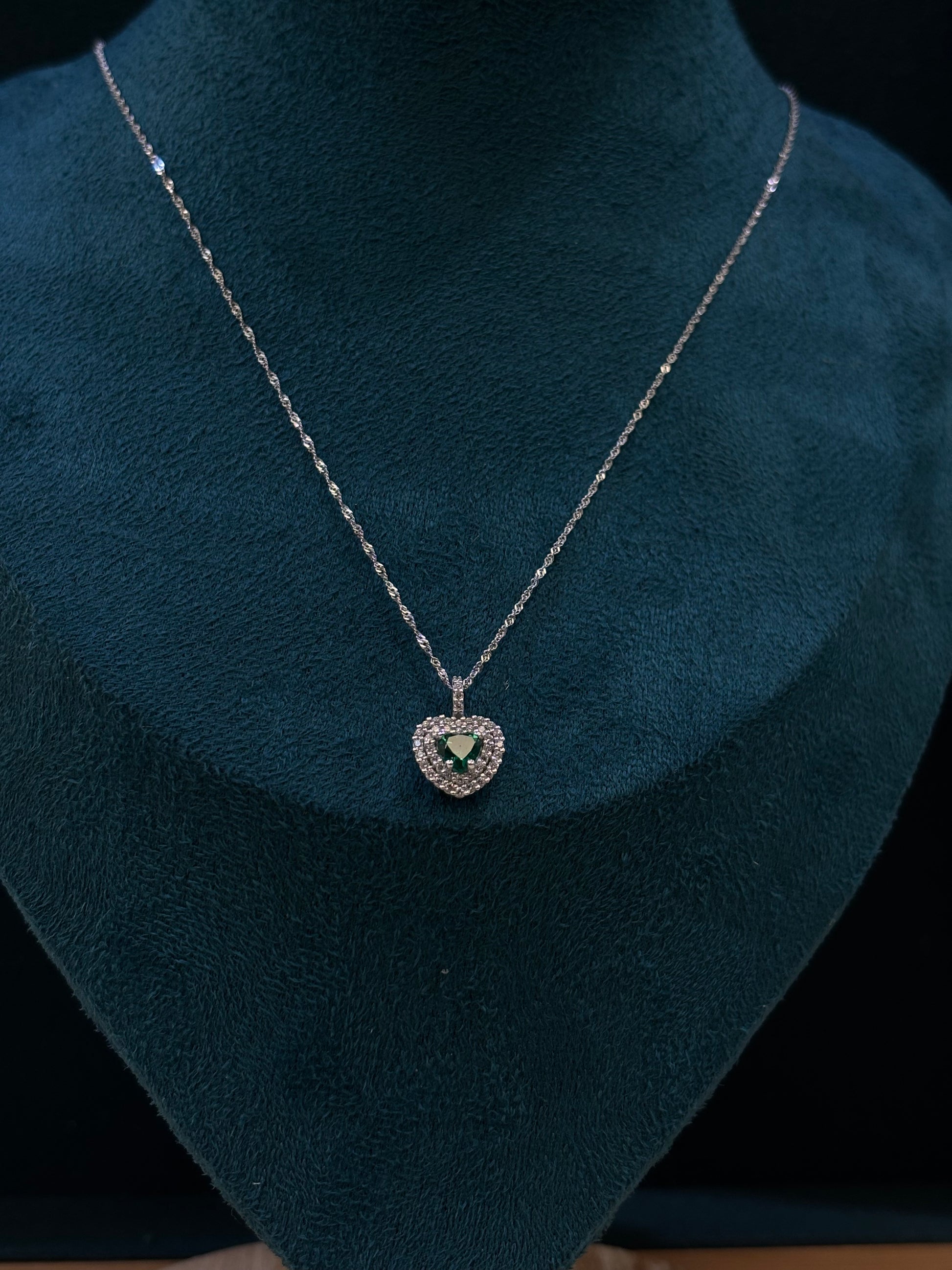 Collana in oro 18 carati con ciondolo cuore verde e due file di zirconi.