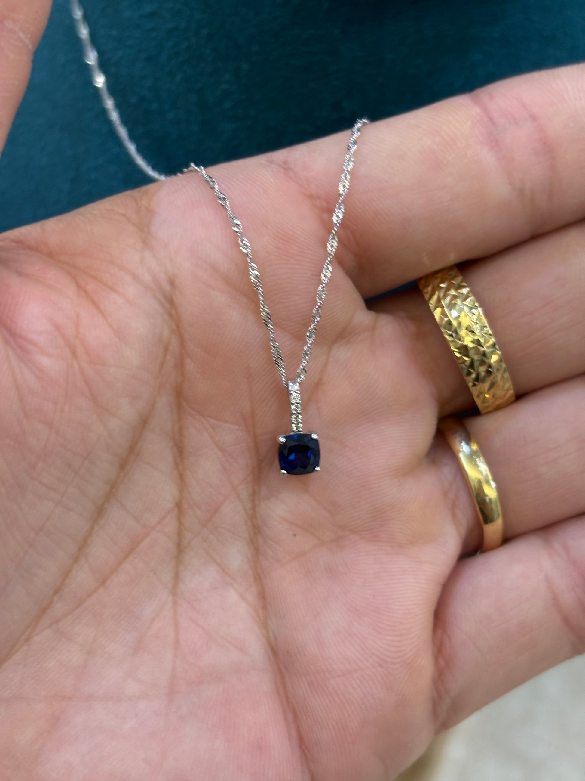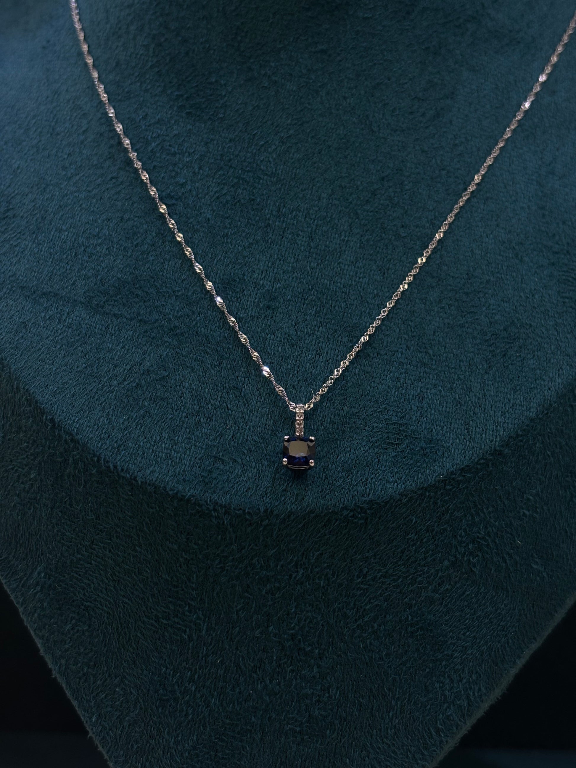 Collana in oro bianco con pietra quadrata blu e zirconi