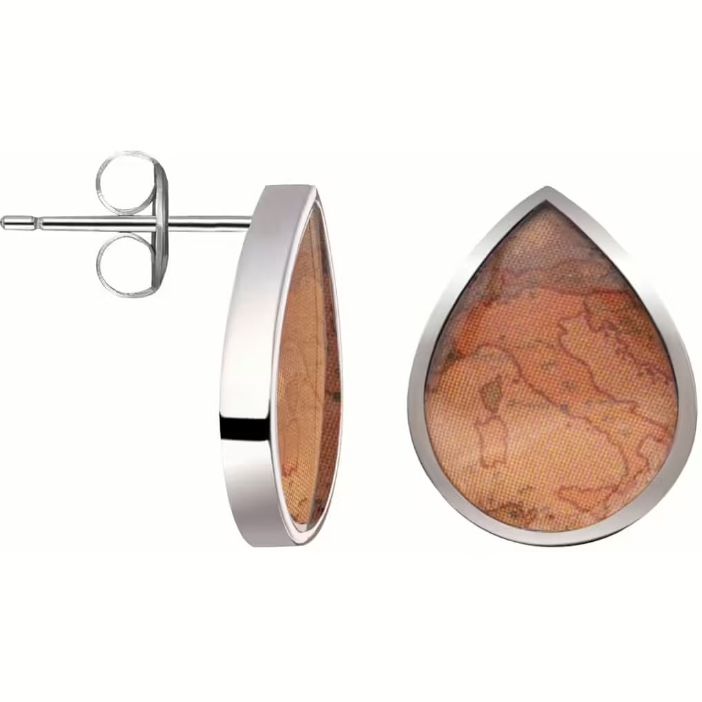 Orecchini da donna di Alviero Martini Prima Classe della collezione OPI. Orecchini a bottone in acciaio e stampa geo map. Chiusura: farfallina. Simbolo: goccia. La referenza è ACJ0176ST