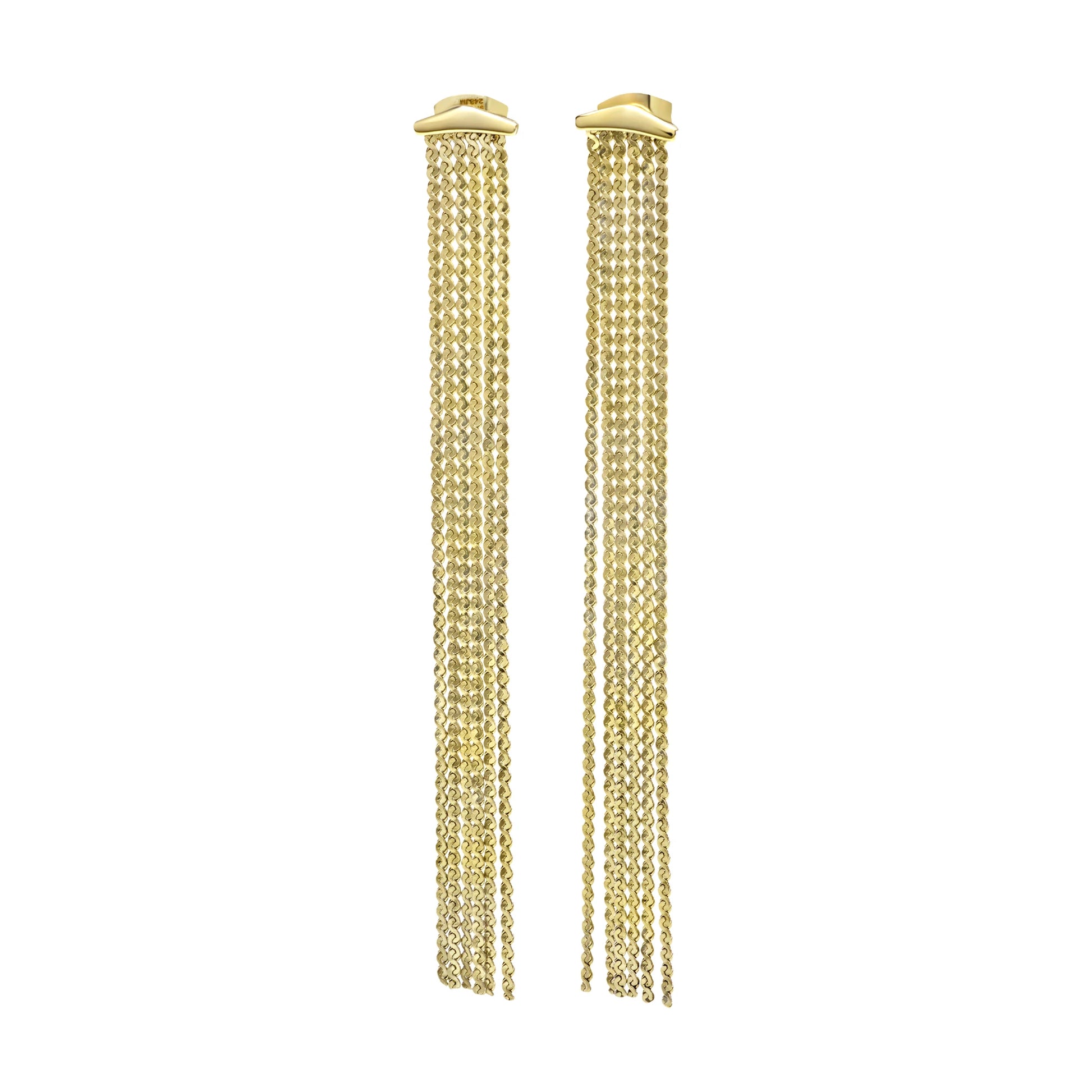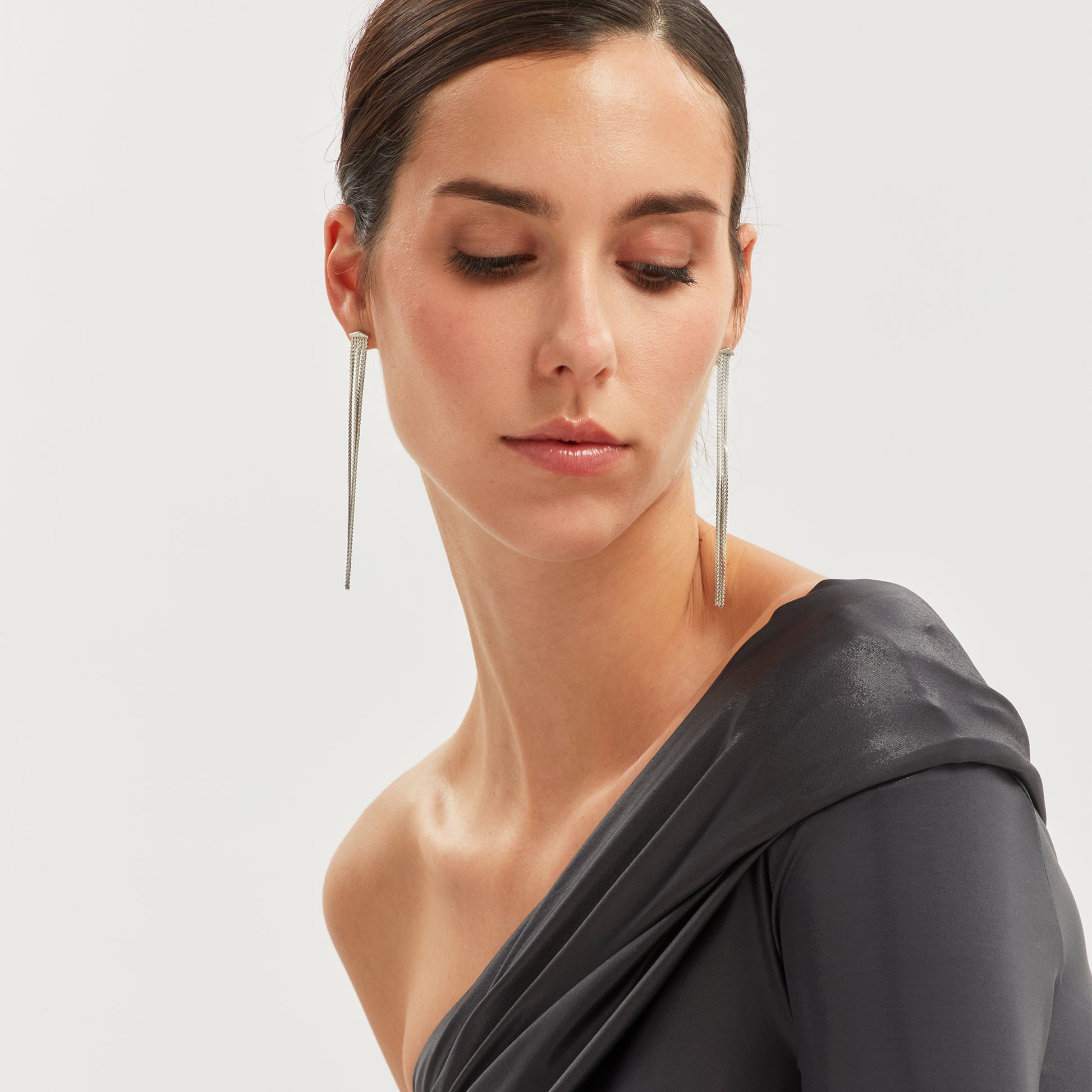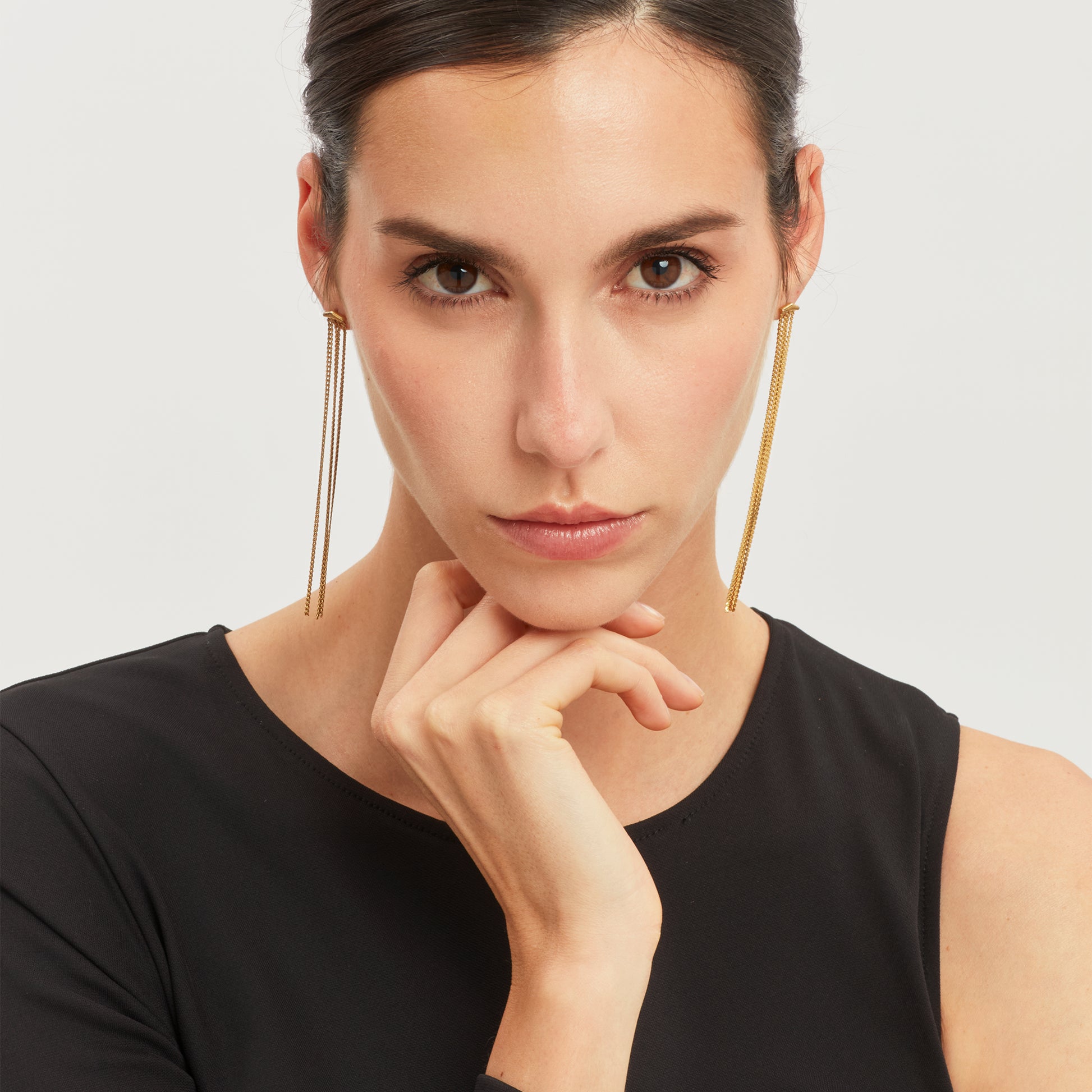 Gli orecchini Roll UP in acciaio combinano eleganza e versatilità. L'elemento al lobo, dal design essenziale e raffinato, si unisce a una cascata di catene, lunghe 10 cm, che accarezzano il collo, regalando luminosità ed armonia al viso. Ideali per chi cerca un tocco audace, ma sofisticato.